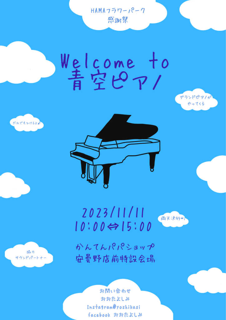 11月11日(土)のHAMAフラワーパーク感謝祭での「青空ピアノ」に、グランドピアノをご提供することになりました。